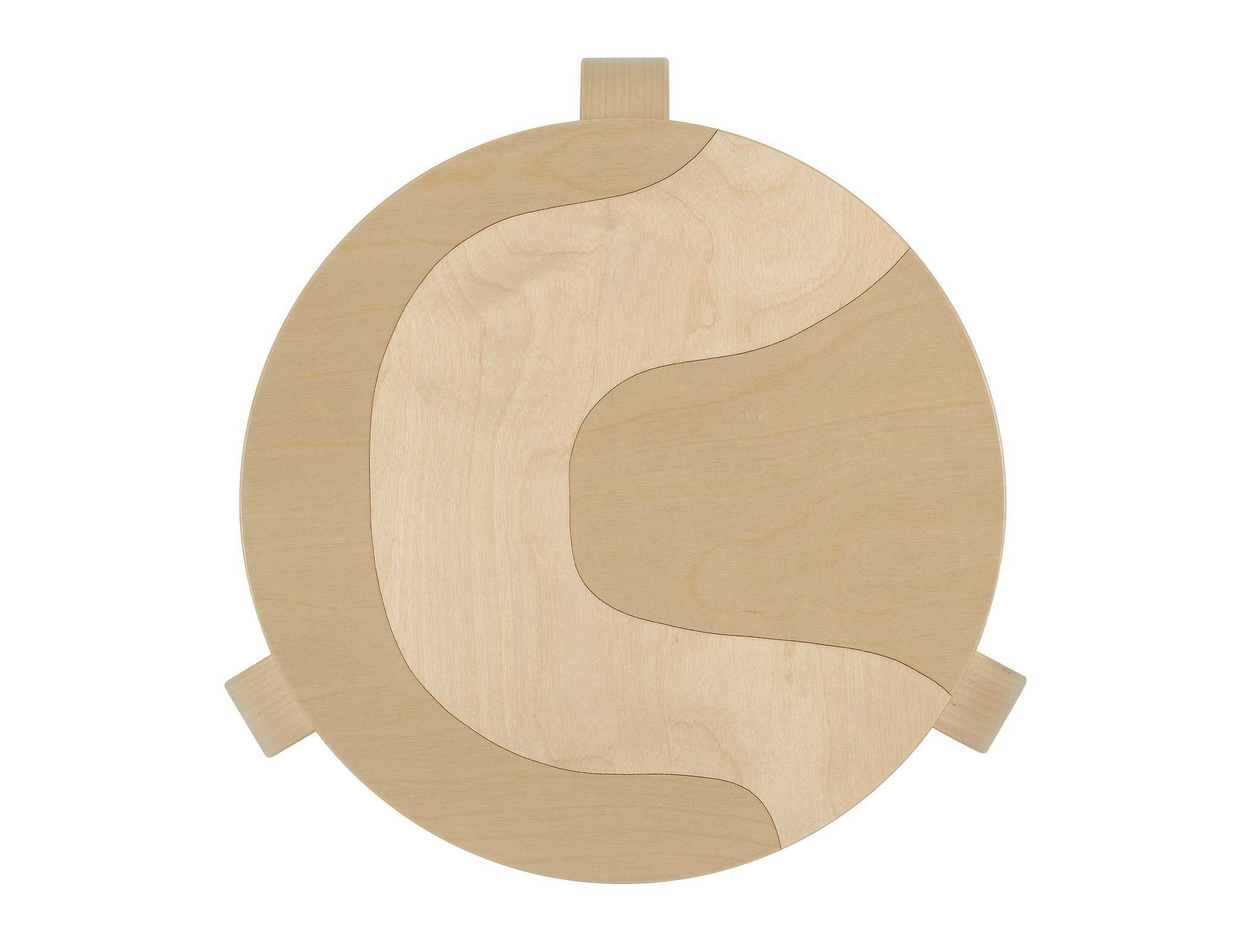 座面の突板をパターンの形に切り取り、それを別個体の該当箇所にはめ込む象嵌(ぞうがん)の技術を用いた斬新な形のコラボレーションにより、マイヤ・イソラのプリントデザインが、木目と木地のコントラストに変換されています。